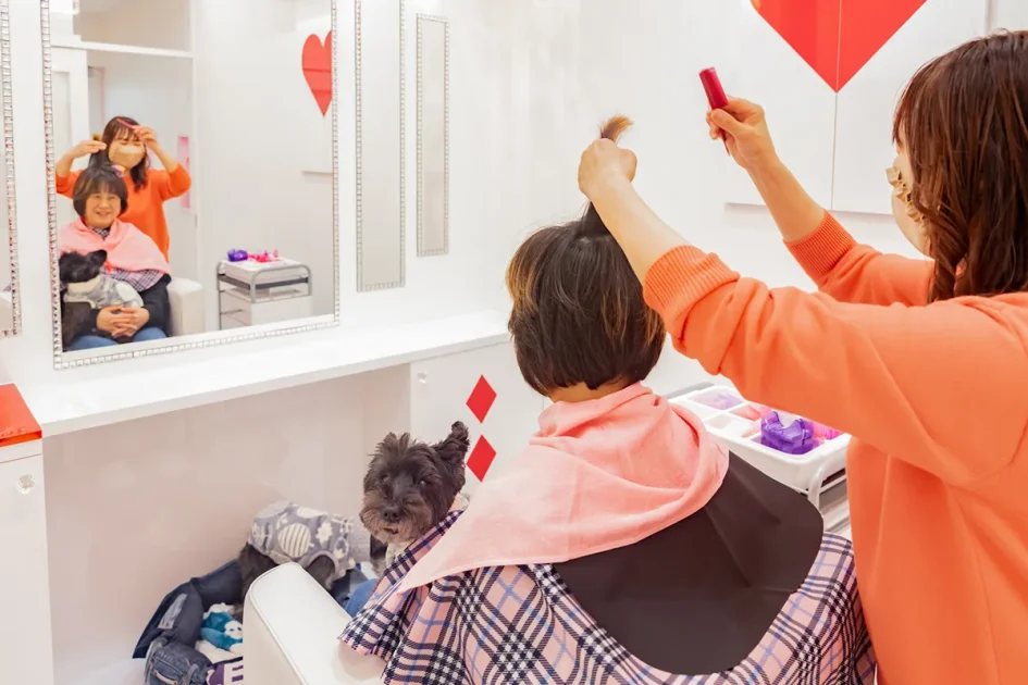 隣がドッグサロンなのでワンちゃんとご一緒にご来店いただけます。人とワンちゃんのキレイ、可愛い、カッコイイが同時に実現できるお店です。美容室からお隣のワンちゃんのカットの様子やホテルの様子を見ることもできます。
